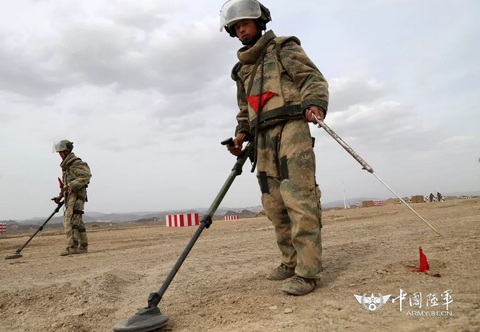 淺灘偵察,接到指令后,裝甲運(yùn)輸車快速?zèng)_擊至淺灘障礙前,工兵班組魚貫而出,排雷手身著20公斤的搜爆服在濁水進(jìn)行排雷作業(yè),水柱騰空而起,防坦克地雷被成功起爆。沖出險(xiǎn)灘后,一片高密度、多型號(hào)的雷場(chǎng)封鎖了裝甲車前進(jìn)的道路,兩名投錨手將半發(fā)雷引爆后,探雷手立即手持探雷器,開始了探雷作業(yè),為了使作業(yè)環(huán)境更加貼近實(shí)戰(zhàn),他們還在雷場(chǎng)中專門增加設(shè)置了鐵絲彈殼等金屬干擾物。