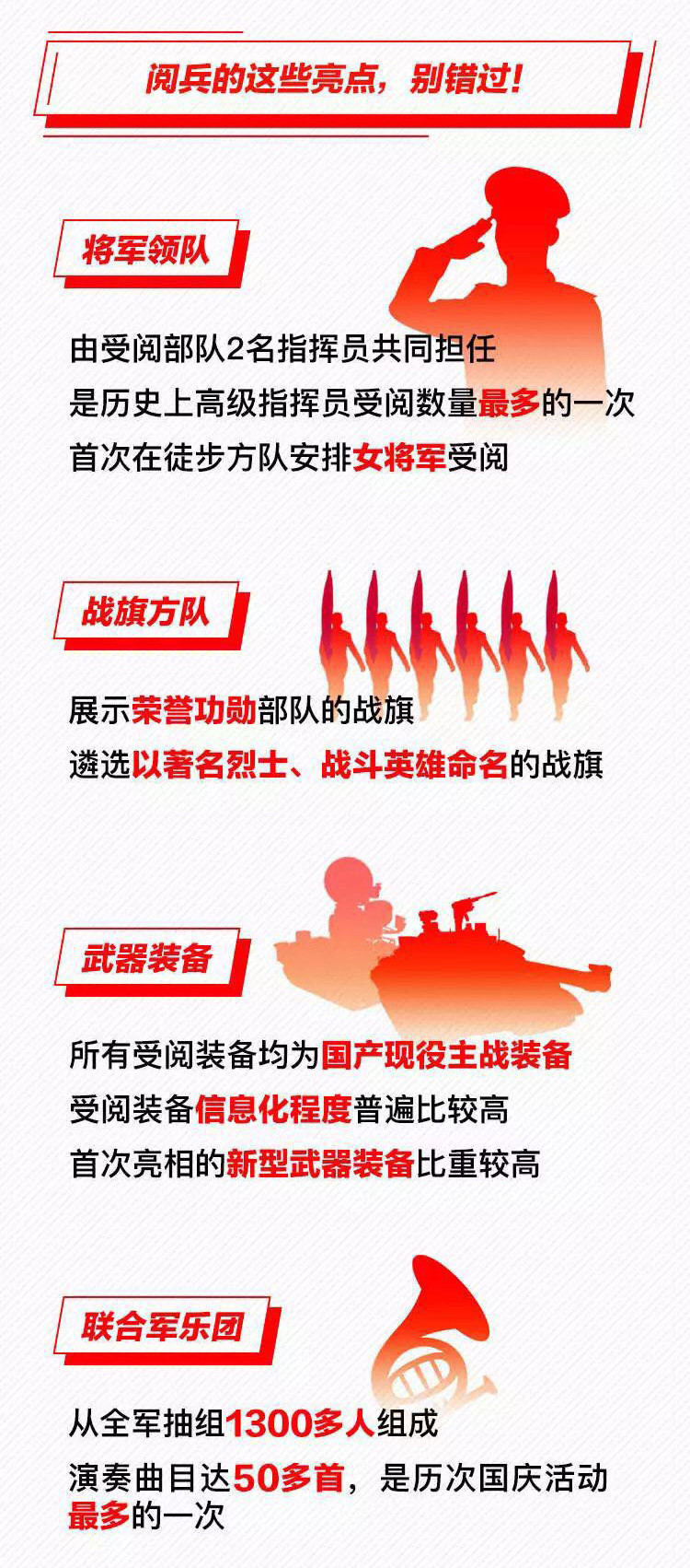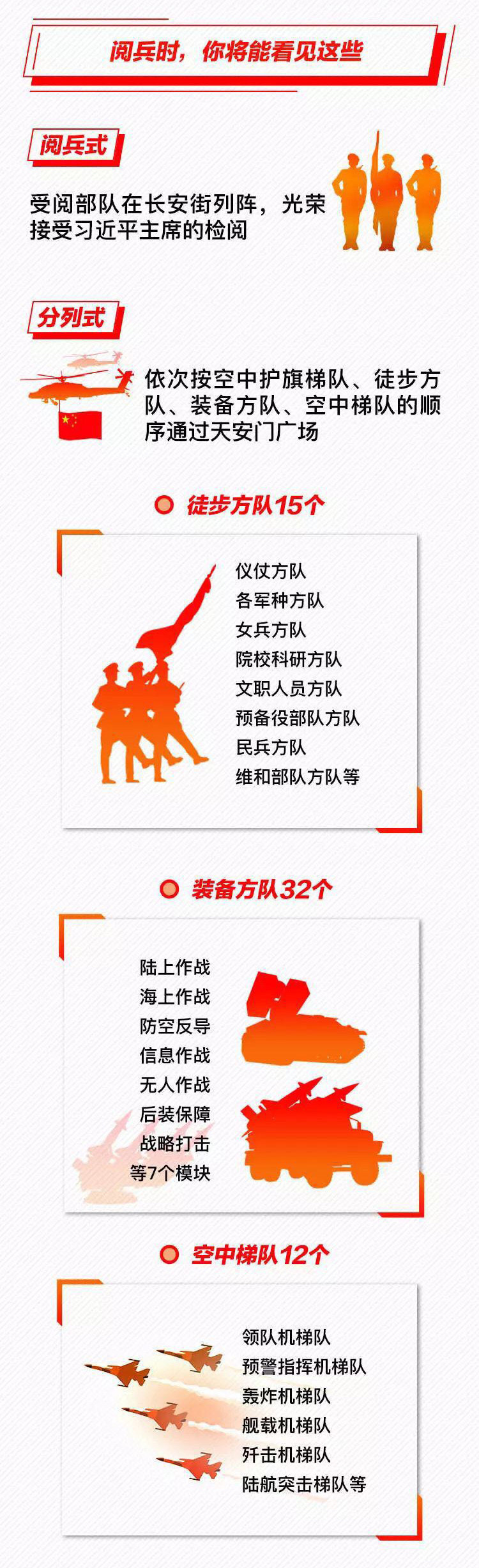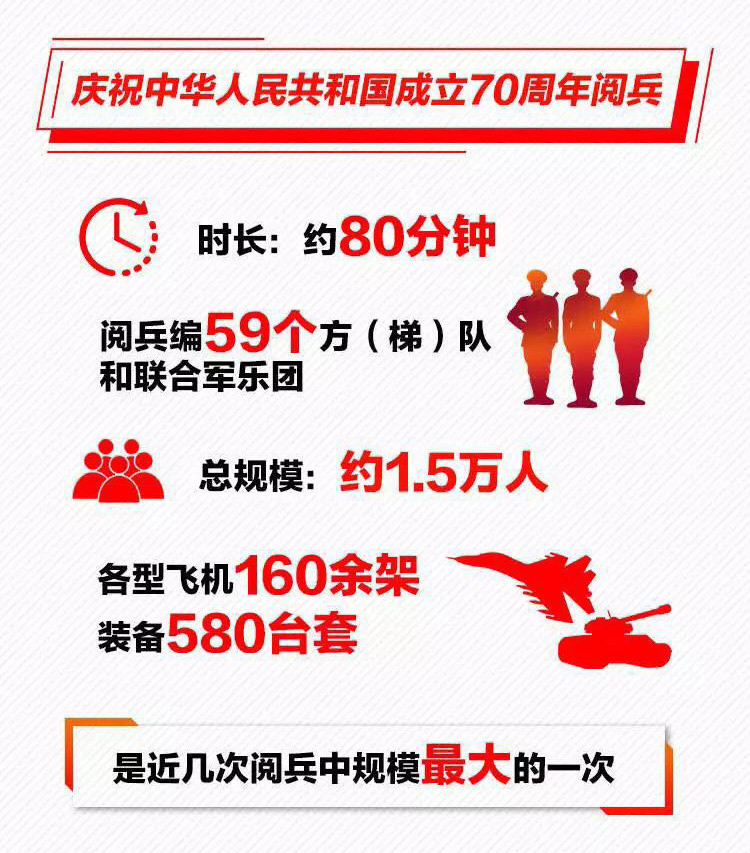 為慶祝新中國(guó)成立70周年,10月1日北京天安門廣場(chǎng)將舉行盛大閱兵式。屆時(shí),32個(gè)裝備方隊(duì)、12個(gè)空中梯隊(duì)將通過(guò)天安門廣場(chǎng),接受檢閱。此次閱兵,所有受閱裝備均為國(guó)產(chǎn)現(xiàn)役主戰(zhàn)裝備,其中包括我軍部分新型裝備,是近幾次閱兵中規(guī)模最大的一次。