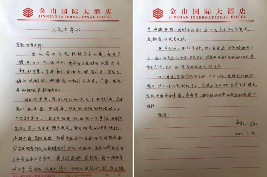 1月30日,在武漢戰(zhàn)“疫”第一線,短短的兩天,讓青年護士王敏、王曉霞最驚訝、最感動的就是防控疫情黨員先行,最危急的關頭、最危險的地方總有共產(chǎn)黨員沖在前面,“我是黨員我先上”成為最響亮的口號。到達武漢的第二天,她們就向內(nèi)蒙古衛(wèi)健委成立的援助武漢臨時黨支部遞交了入黨申請書。她們表示,要在武漢防疫一線努力工作,向黨員同志學習、看齊,以實際行動早日成為一名正式的共產(chǎn)黨員!