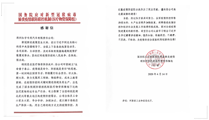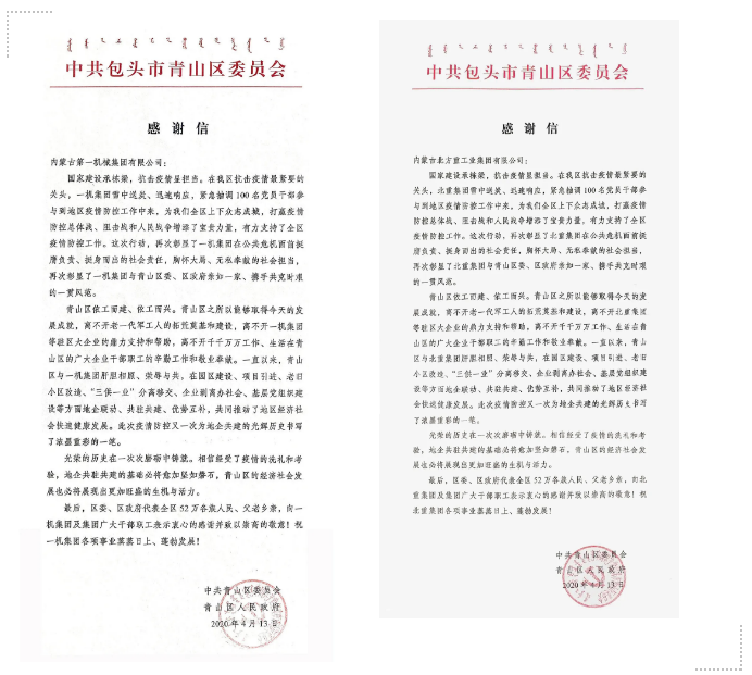 近日,中國(guó)兵器工業(yè)集團(tuán)豫西集團(tuán)鄭州紅宇專汽公司、一機(jī)集團(tuán)和北重集團(tuán)分別收到國(guó)務(wù)院應(yīng)對(duì)新型冠狀病毒肺炎疫情聯(lián)防聯(lián)控機(jī)制醫(yī)療物資保障組,包頭市青山區(qū)委、區(qū)政府發(fā)來的感謝信、慰問信,對(duì)他們?cè)诖蜈A疫情防控人民戰(zhàn)爭(zhēng)、總體戰(zhàn)、阻擊戰(zhàn)中作出的貢獻(xiàn)表示感謝。 豫西集團(tuán)鄭州紅宇專汽公司收到國(guó)務(wù)院聯(lián)防聯(lián)控機(jī)制感謝信 4月14日,國(guó)務(wù)院應(yīng)對(duì)新型冠狀病毒肺炎疫情聯(lián)防聯(lián)控機(jī)制醫(yī)療物資保障組向中國(guó)兵器工業(yè)集團(tuán)豫西集團(tuán)鄭州紅宇專汽公司發(fā)來感謝信。 豫西集團(tuán)鄭州紅宇專汽公司收到國(guó)務(wù)院應(yīng)對(duì)新型冠狀病毒肺炎疫情聯(lián)防聯(lián)控機(jī)制醫(yī)療物資保障組發(fā)來的感謝信 信中指出,新冠肺炎疫情發(fā)生以來,在以習(xí)近平同志為核心的黨中央堅(jiān)強(qiáng)領(lǐng)導(dǎo)下,全國(guó)上下各條戰(zhàn)線緊急動(dòng)員、各司其職、主動(dòng)擔(dān)責(zé),及時(shí)采取有效措施遏制疫情擴(kuò)散蔓延勢(shì)頭,堅(jiān)決打好疫情防控的人民戰(zhàn)爭(zhēng)、總體戰(zhàn)、阻擊戰(zhàn)。 特別是在醫(yī)療物資保供戰(zhàn)中,鄭州紅宇專汽公司牢固樹立“生命重于泰山、疫情就是命令、防控就是責(zé)任”的思想,第一時(shí)間響應(yīng)國(guó)家號(hào)召,積極履行社會(huì)責(zé)任,識(shí)大體、顧大局,努力克服用工短缺、物流停運(yùn)、成本上漲等困難,在疫情防控的關(guān)鍵時(shí)期連續(xù)超負(fù)荷生產(chǎn),出色完成了國(guó)務(wù)院聯(lián)防聯(lián)控機(jī)制醫(yī)療物資保障組下達(dá)的醫(yī)療廢物轉(zhuǎn)運(yùn)車生產(chǎn)任務(wù),有力保障了全國(guó)特別是湖北武漢等重點(diǎn)地區(qū)的疫情防控需求。公司全體員工舍小家為大家、爭(zhēng)分奪秒、加班加點(diǎn),夜以繼日奮戰(zhàn)在生產(chǎn)保供一線,用自己特有的方式支持疫情防控,為打贏疫情防控阻擊戰(zhàn)作出了突出貢獻(xiàn)。 鄭州紅宇專汽公司緊急生產(chǎn)醫(yī)療廢物轉(zhuǎn)運(yùn)車并及時(shí)發(fā)運(yùn) 疫情發(fā)生以來,鄭州紅宇專汽公司已簽約醫(yī)療廢物轉(zhuǎn)運(yùn)車107臺(tái),累計(jì)下線90臺(tái),交付83臺(tái)。 一機(jī)集團(tuán)和北重集團(tuán)收到中共包頭市青山區(qū)委員會(huì)、青山區(qū)人民政府發(fā)來的感謝信和慰問信 4月13日,中共包頭市青山區(qū)委員會(huì)、青山區(qū)人民政府向中國(guó)兵器工業(yè)集團(tuán)一機(jī)集團(tuán)和北重集團(tuán)發(fā)來感謝信和慰問信,對(duì)參與青山區(qū)防控疫情一線工作的一機(jī)集團(tuán)、北重集團(tuán)黨員干部職工及給予充分理解、全力支持的家屬們,表示衷心的感謝并致以最崇高的敬意!