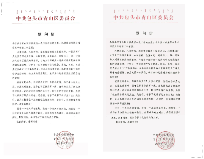一機(jī)集團(tuán)、北重集團(tuán)收到中共包頭市青山區(qū)委員會(huì)、青山區(qū)人民政府發(fā)來的慰問信 信中指出,在青山區(qū)抗擊疫情最緊要的關(guān)頭,一機(jī)集團(tuán)、北重集團(tuán)雪中送炭、迅速響應(yīng),分別緊急抽調(diào)百余名黨員干部參與到地區(qū)疫情防控工作中,為全區(qū)上下眾志成城,打贏疫情防控的人民戰(zhàn)爭(zhēng)、總體戰(zhàn)、阻擊戰(zhàn)增添了寶貴力量,有力支持了全區(qū)疫情防控工作,彰顯了一機(jī)集團(tuán)、北重集團(tuán)在公共危機(jī)面前挺膺負(fù)責(zé)、挺身而出的社會(huì)責(zé)任,胸懷大局、無私奉獻(xiàn)的社會(huì)擔(dān)當(dāng)。 一機(jī)集團(tuán)黨員干部馳援青山區(qū)疫情防控一線 北重集團(tuán)黨員干部馳援青山區(qū)疫情防控一線 來源/豫西集團(tuán)紅宇專汽公司、一機(jī)集團(tuán)、北重集團(tuán)