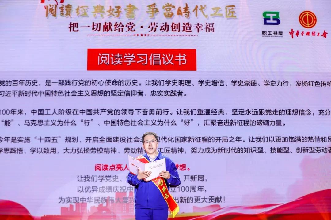 全國勞動(dòng)模范、兵器工業(yè)集團(tuán)北方車輛集團(tuán)職工馬小光宣讀參加“把一切獻(xiàn)給黨·勞動(dòng)創(chuàng)造幸福”全國職工黨史學(xué)習(xí)教育讀書活動(dòng)倡議書