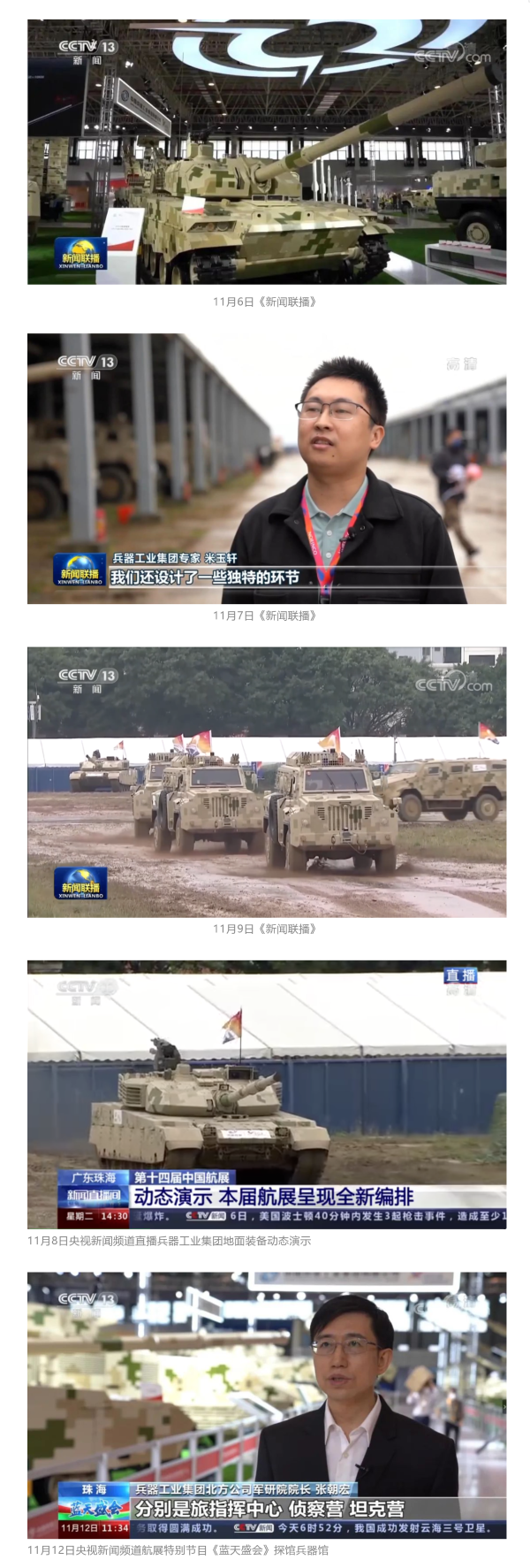 11月6日、7日、9日,央視《新聞聯(lián)播》三次報道兵器工業(yè)集團參展情況,重點介紹了集團公司總體參展情況、地面裝備動態(tài)演示全新編排、國產(chǎn)輪式反伏擊車首次采用有人駕駛和無人駕駛混合編隊等內(nèi)容。11月8日,央視新聞頻道直播地面裝備動態(tài)演示;11月12日,央視新聞頻道航展特別報道《藍天盛會》探訪兵器館,采訪兵器工業(yè)集團嘉賓對陸軍合成旅作了報道。