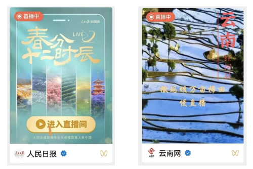 3月20日為農(nóng)歷二十四節(jié)氣的春分,在中國兵器工業(yè)集團有限公司的助力下,人民日報、云南網(wǎng)等主流媒體再次聚焦紅河縣撒瑪壩萬畝梯田,人民日報新媒體平臺策劃推出“春分十二時辰”直播活動,通過鏡頭展示祖國各地春分時節(jié)壯美的自然風光。其中,人民日報視頻號和云南網(wǎng)視頻號在中午時段的直播中,紅河縣撒瑪壩萬畝梯田出現(xiàn)在觀眾的視野里,贏得了數(shù)十萬觀眾的點贊,產(chǎn)生了良好的社會效應。