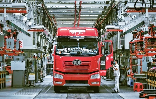 企業(yè)強(qiáng)則國家強(qiáng),加快建設(shè)世界一流企業(yè)是全面建設(shè)社會(huì)主義現(xiàn)代化國家的重大任務(wù),是新時(shí)代國有企業(yè)的戰(zhàn)略目標(biāo)。近來,一汽解放集團(tuán)股份有限公司生產(chǎn)按下“加速鍵”。圖為2022年6月15日,工人在位于吉林長春的一汽解放總裝車間內(nèi)裝配車輛。 新華社記者 許暢/攝