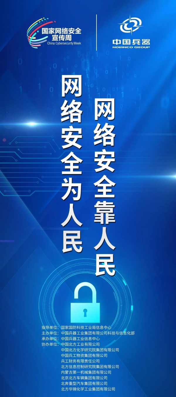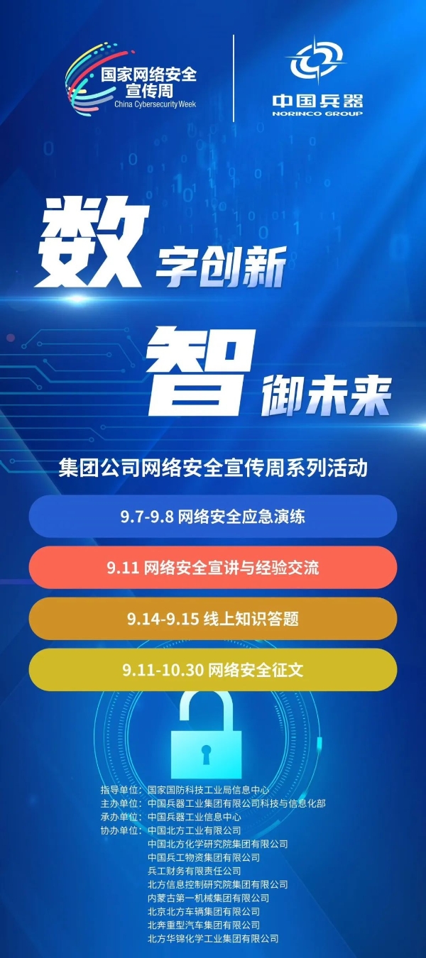9月11日至17日,中國兵器工業(yè)集團有限公司以“數(shù)字創(chuàng)新 智御未來”為主題,圍繞集團公司“1+5”戰(zhàn)略和“雙十”規(guī)劃,組織開展集團公司網(wǎng)絡安全宣傳周系列活動。