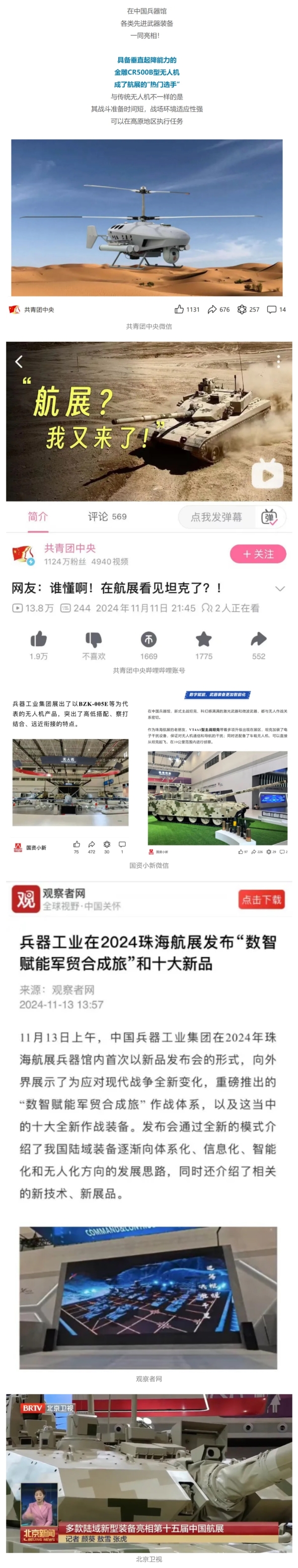 11月13日央視新聞《藍(lán)天之約》直播地面裝備動(dòng)態(tài)演示此次航展,央視綜合頻道《新聞聯(lián)播》《晚間新聞》、新聞?lì)l道《新聞直播間》《新聞30分》《朝聞天下》《共同關(guān)注》《東方時(shí)空》《午夜新聞》、財(cái)經(jīng)頻道《天下財(cái)經(jīng)》《經(jīng)濟(jì)信息聯(lián)播》《正點(diǎn)財(cái)經(jīng)》《第一時(shí)間》、中文國(guó)際頻道《今日環(huán)球》《中國(guó)新聞》、國(guó)防軍事頻道《軍事報(bào)道》《正午國(guó)防軍事》《國(guó)防軍事早報(bào)》《軍迷行天下》等欄目共播出兵器工業(yè)集團(tuán)參展相關(guān)新聞報(bào)道40余條。11月10日央視新聞?lì)l道《新聞30分》11月10日央視中文國(guó)際頻道《中國(guó)新聞》11月10日央視國(guó)防軍事頻道《軍事報(bào)道》11月11日央視國(guó)防軍事頻道《正午國(guó)防軍事》
