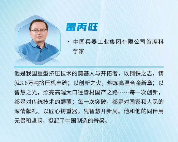 雷丙旺是我國極端金屬擠壓技術(shù)的開拓者,扎根邊疆地區(qū)國防特大型企業(yè)工作38年,長期從事金屬成形制造裝備與工藝研究工作。他研制出我國極限制造的大國重器——3.6萬噸黑色金屬垂直擠壓機,一舉打破國外技術(shù)封鎖,填補國內(nèi)空白,實現(xiàn)了超(超)臨界電站核心管道和航空發(fā)動機高壓渦輪盤粉末合金棒材的中國制造,開發(fā)出成套關(guān)鍵技術(shù),取得一系列原創(chuàng)性成果,促進了產(chǎn)業(yè)的融合發(fā)展,創(chuàng)造巨大經(jīng)濟社會效益。