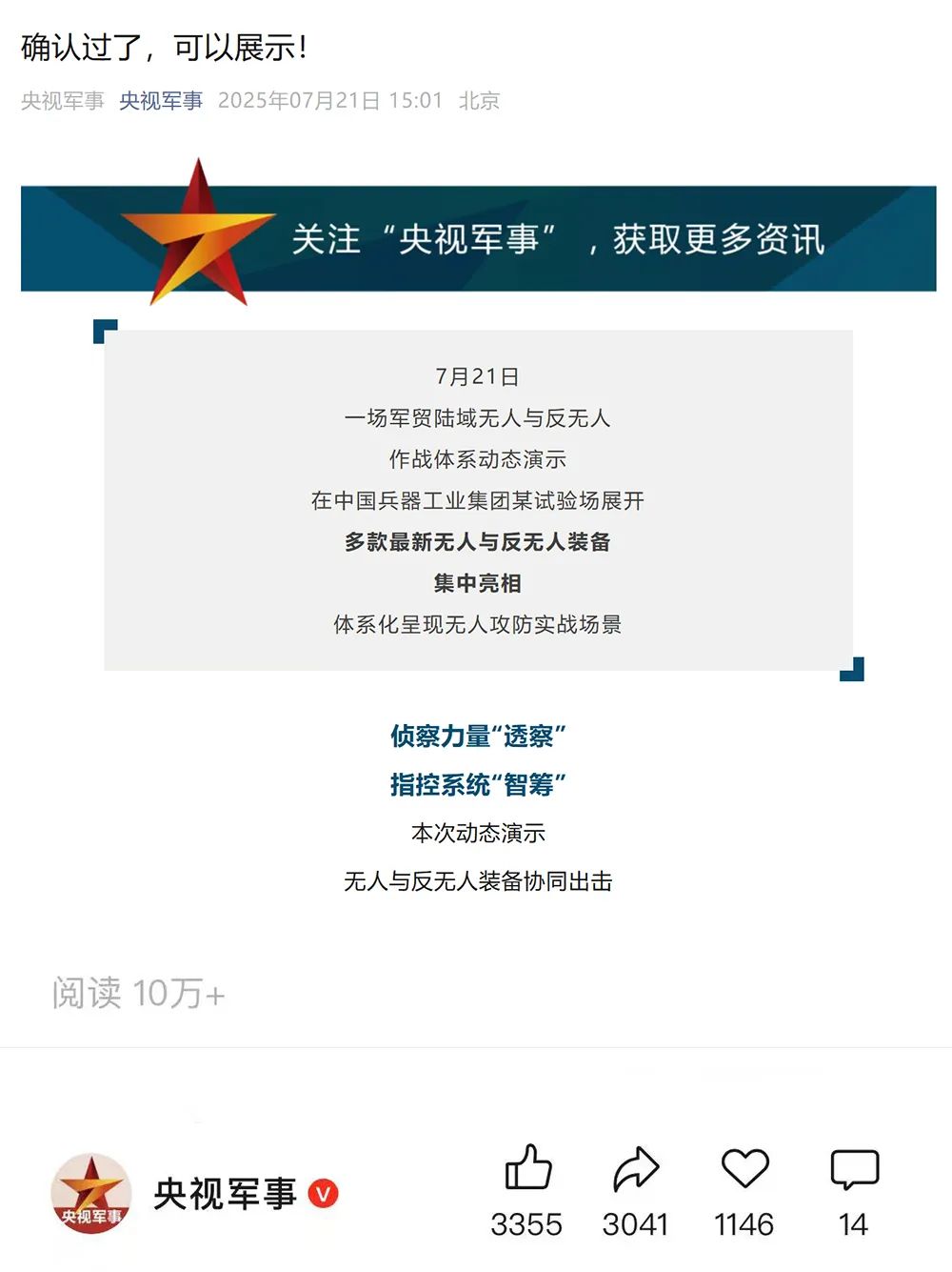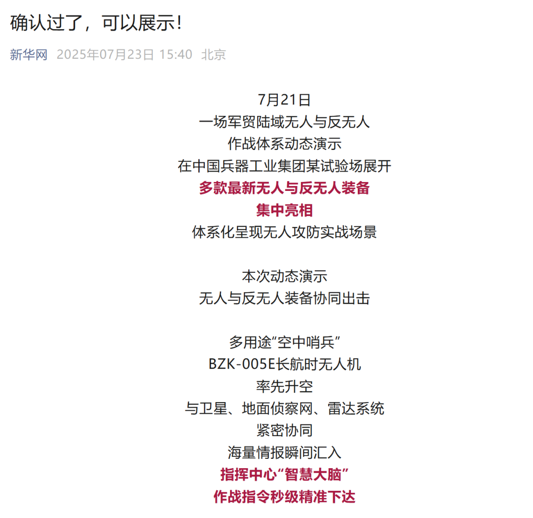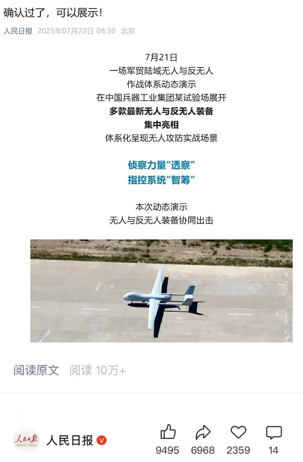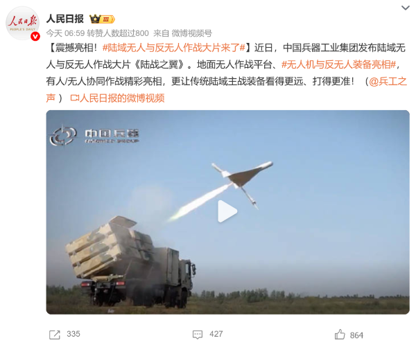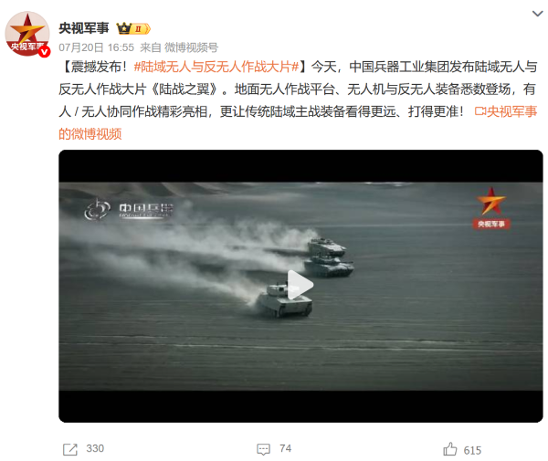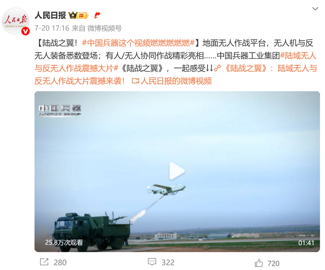 7月21日,中國兵器工業(yè)集團(tuán)有限公司在位于內(nèi)蒙古的某試驗(yàn)場舉辦軍貿(mào)陸域無人與反無人作戰(zhàn)體系主題日活動,攜無人機(jī)、巡飛彈、反無人機(jī)等最新武器裝備登場亮相,展現(xiàn)了一場無人與反無人領(lǐng)域激烈對抗的實(shí)戰(zhàn)場景。中央主流媒體、地方媒體、知名網(wǎng)絡(luò)媒體,以及集團(tuán)公司各宣傳平臺紛紛進(jìn)行報(bào)道,多次登上熱搜,引發(fā)廣泛關(guān)注。 央視新聞頻道《新聞直播間》《東方時空》《24小時》、國防軍事頻道《正午國防軍事》《軍事報(bào)道》《國防軍事早報(bào)》、中文國際頻道《今日環(huán)球》、央視軍事新媒體等報(bào)道了集團(tuán)公司軍貿(mào)陸域無人與反無人作戰(zhàn)體系首次公開實(shí)裝動態(tài)演示有關(guān)情況,重點(diǎn)介紹了無人與反無人作戰(zhàn)最新裝備。 央視新聞頻道《新聞直播間》:內(nèi)蒙古 軍貿(mào)陸域無人與反無人作戰(zhàn)最新裝備亮相 央視新聞頻道《新聞直播間》:內(nèi)蒙古 軍貿(mào)陸域無人與反無人作戰(zhàn)最新裝備亮相 記者探訪無人裝備展區(qū) 央視新聞頻道《新聞直播間》:軍貿(mào)陸域無人與反無人作戰(zhàn)最新裝備亮相·記者探訪 最強(qiáng)“盾牌” 反無人機(jī)系統(tǒng)新升級 人民日報(bào)微博、央視軍事微博、央視新聞客戶端、中國新聞網(wǎng)、中新社國是直通車抖音、環(huán)球網(wǎng)微博、環(huán)球時報(bào)(X平臺、英文版客戶端)、中國日報(bào)網(wǎng)、央視軍事報(bào)道微博、中國軍號微博、中央廣播電視總臺“空天逐夢”微信視頻號、共青團(tuán)中央B站、國資小新微博等中央主流媒體、國家部委的新媒體播發(fā)集團(tuán)公司陸域無人與反無人作戰(zhàn)大片等視頻作品。 人民日報(bào)微博 央視軍事微博 人民日報(bào)、新華網(wǎng)、央視軍事、央視新聞、中央廣播電視總臺中國之聲、中國新聞網(wǎng)、中國日報(bào)網(wǎng)、中國日報(bào)英文報(bào)刊《CHINA DAILY》、《科技日報(bào)》、光明日報(bào)客戶端、環(huán)球網(wǎng)、環(huán)球時報(bào)、人民日報(bào)海外版-海外網(wǎng)、央視網(wǎng)、小央視頻、參考消息、瞭望東方周刊、共青團(tuán)中央、國資小新新媒體、新浪網(wǎng)、騰訊網(wǎng)、搜狐網(wǎng)、鳳凰網(wǎng)、網(wǎng)易網(wǎng)等中央主流媒體、國家部委的新媒體及知名網(wǎng)絡(luò)媒體對集團(tuán)公司軍貿(mào)陸域無人與反無人作戰(zhàn)體系主題日活動進(jìn)行了圖文、音頻、視頻報(bào)道。 央視軍事微信 人民日報(bào)微信 新華網(wǎng)微信 來源/各主流媒體 |