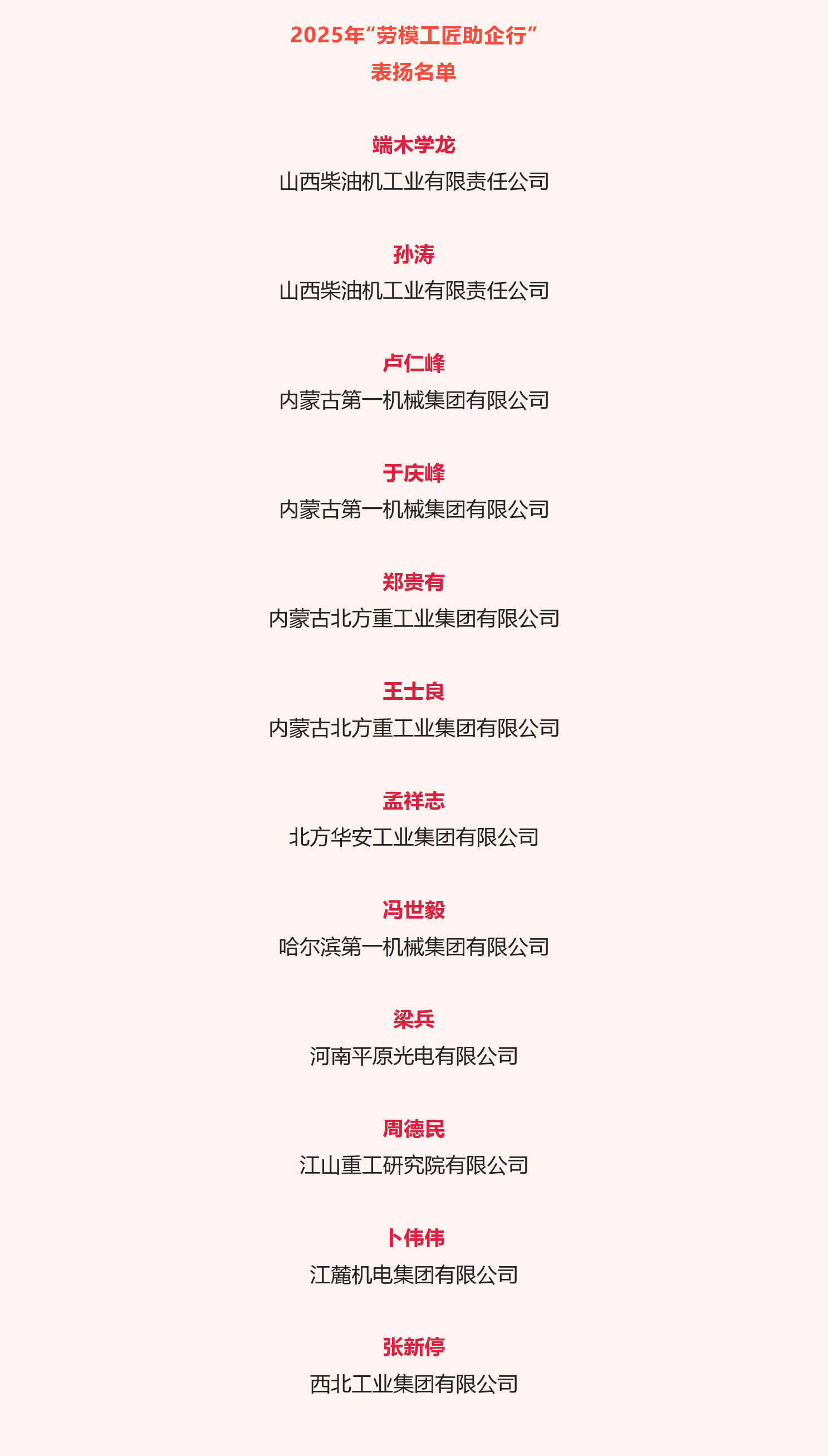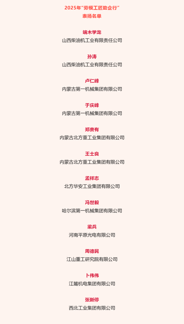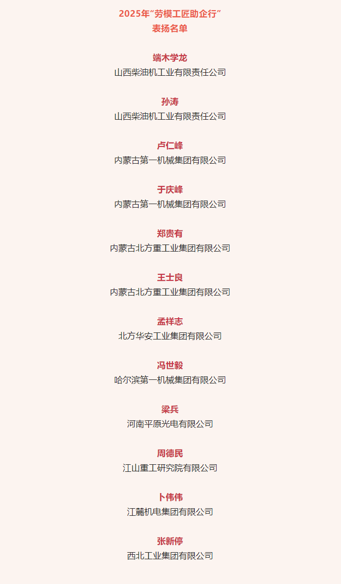 近日,中華全國總工會公布2025年“勞模工匠助企行”表揚名單,兵器工業(yè)集團12名勞模工匠入選。